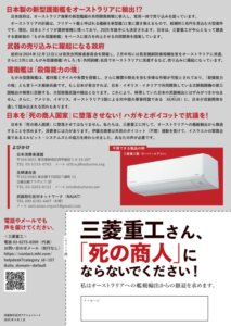 消費者団体の日本消費者連盟と主婦連合会は、市民団体の武器取引反対ネットワーク【NAJAT】と3団体合同で、3月20日から、武器輸出に邁進する三菱重工と三菱電機への不買運動と武器輸出中止を求めるはがき投函を市民に呼びかけるアクションを始めます。