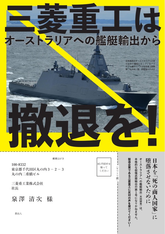 消費者団体の日本消費者連盟と主婦連合会は、市民団体の武器取引反対ネットワーク【NAJAT】と3団体合同で、3月20日から、武器輸出に邁進する三菱重工と三菱電機への不買運動と武器輸出中止を求めるはがき投函を市民に呼びかけるアクションを始めます。
